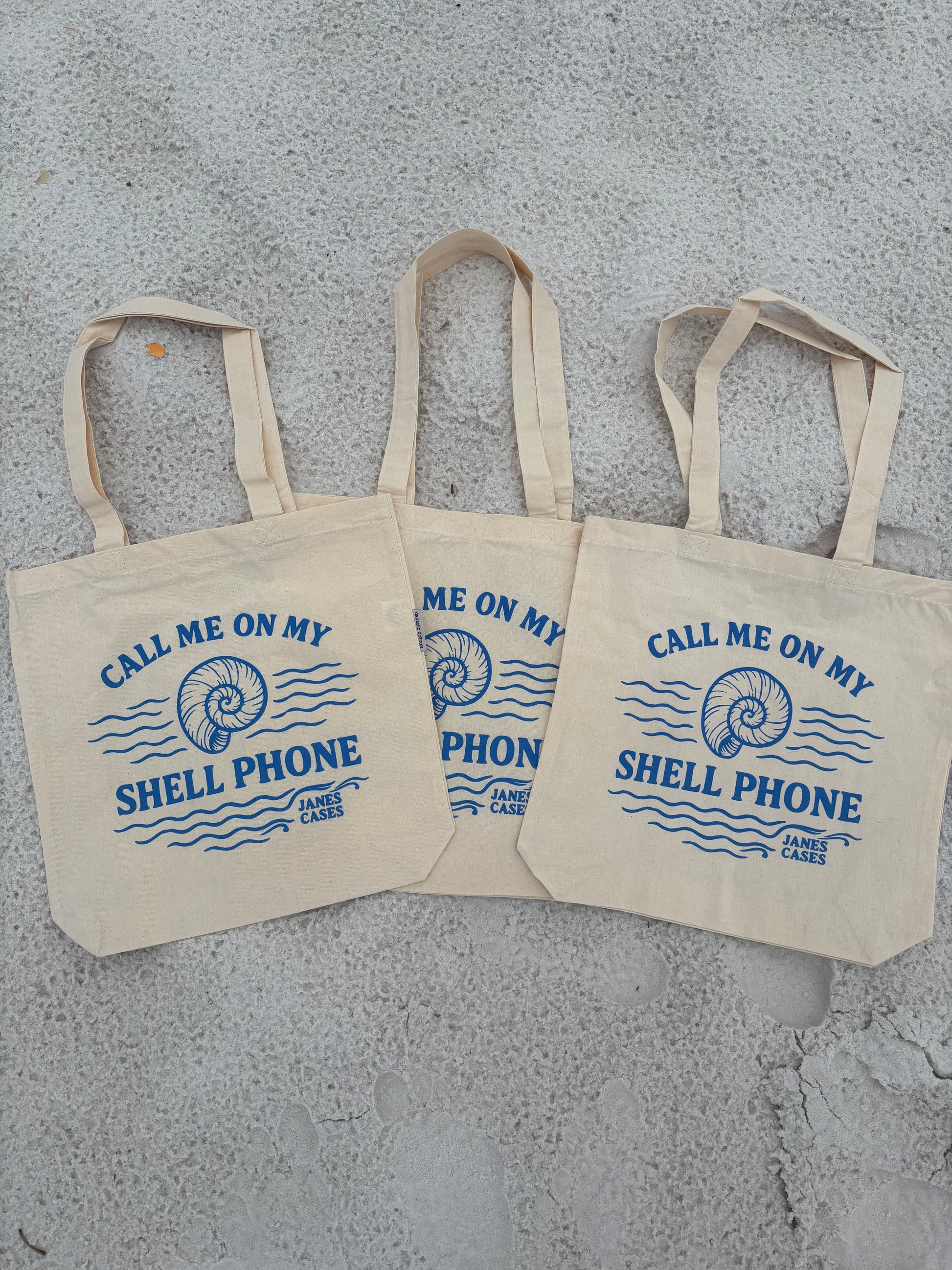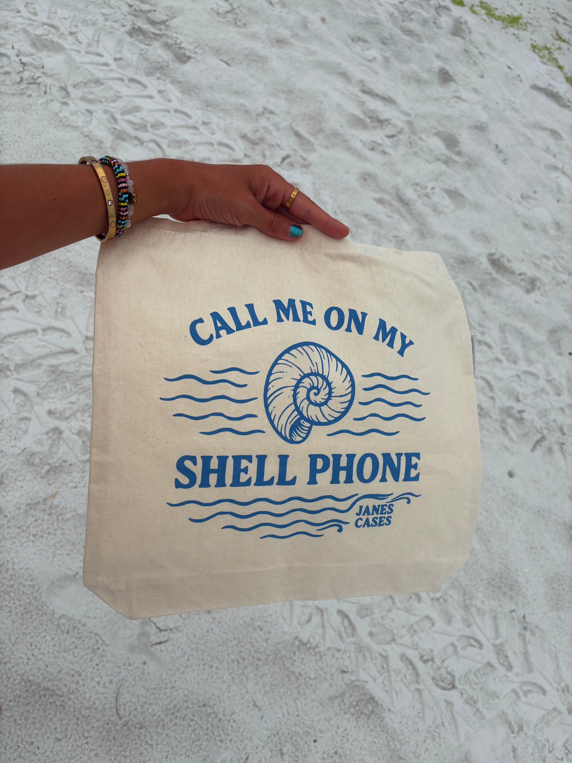 Make a splash wherever you go with our exclusive Call Me on My Shell Phone tote bag! Featuring our new ocean-inspired logo, this spacious and durable bag brings beachy charm to your everyday errands. Perfect for carrying seashells, groceries, or your favorite seaside essentials. Designed with coastal lovers in mind, just like our signature seashell phone cases.